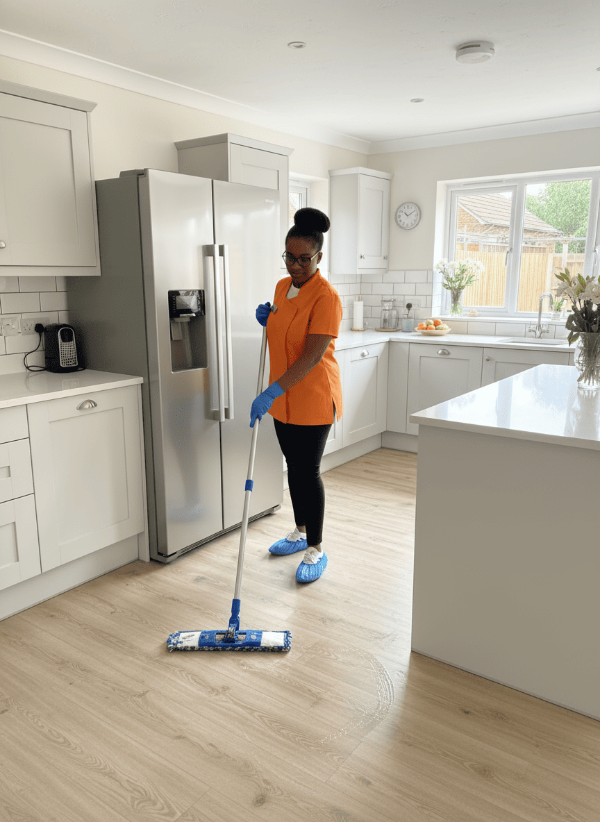Vacuuming and mopping all floors, including corners, edges, and skirting boards, to remove fine dust and leave a polished finish.